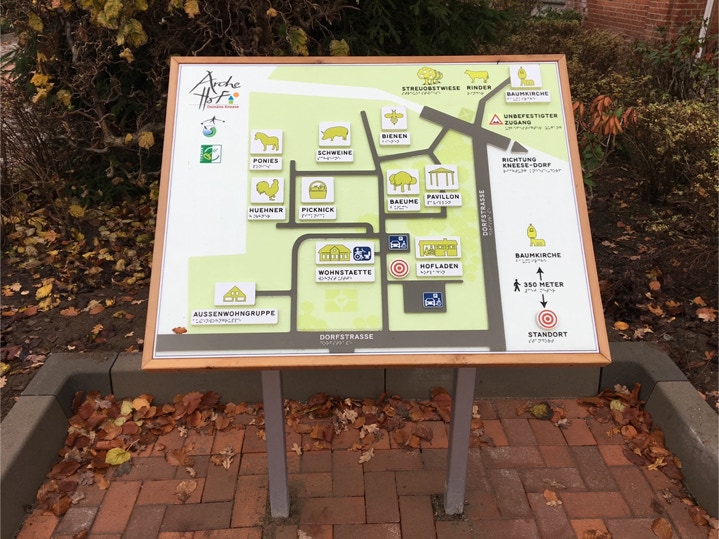 Zur besseren Orientierung wurden Informationsschilder mit Braillie-Schrift aufgestellt. Für die Bewohner und Besucher des Archehofes gibt es jetzt Schilder mit Informationen über die vorhandenen Tiere und Pflanzen.