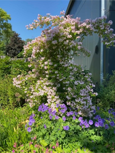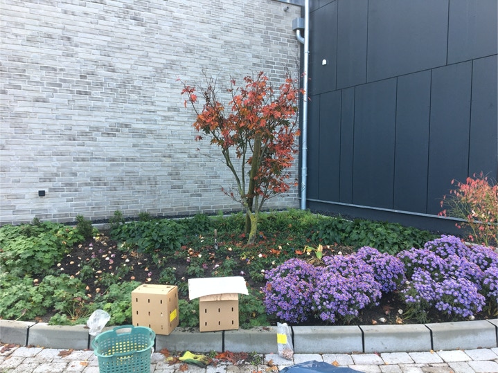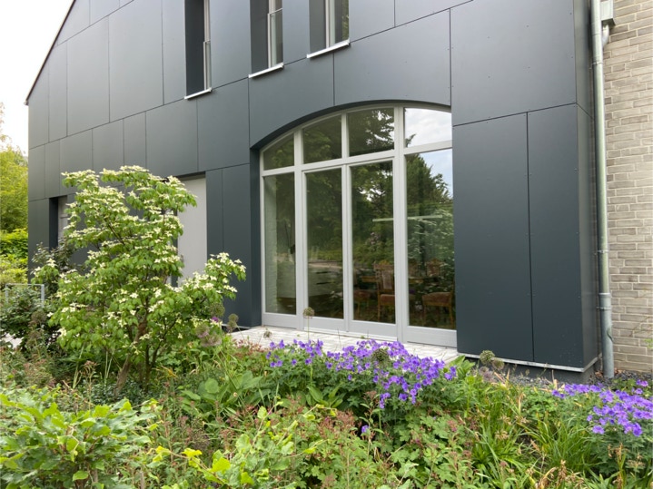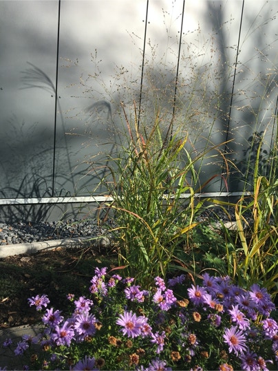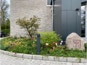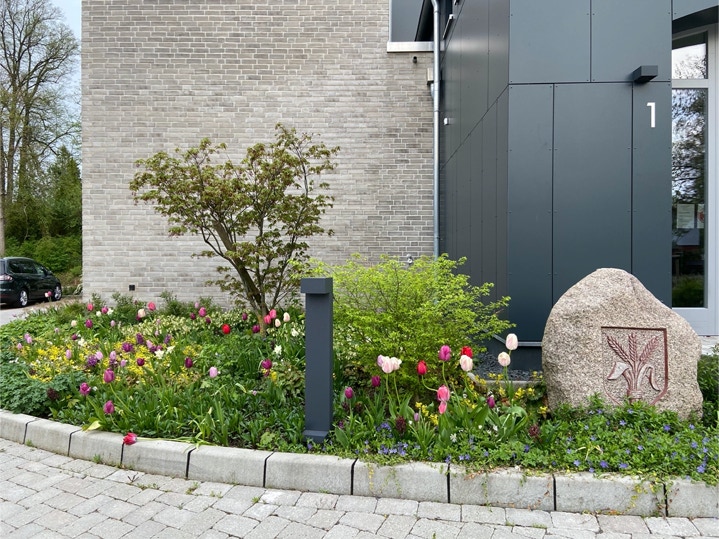 Es musste beachtet werden, welche Bereiche durch das Gebäude sehr schattig oder sonnig liegen. Stauden wie Aster, Beinwell, Elfenblume, Immergrün, Funkie und Thymian wurden danach ausgewählt. Gräser bilden gerade im Herbst einen besonderen Anblick.