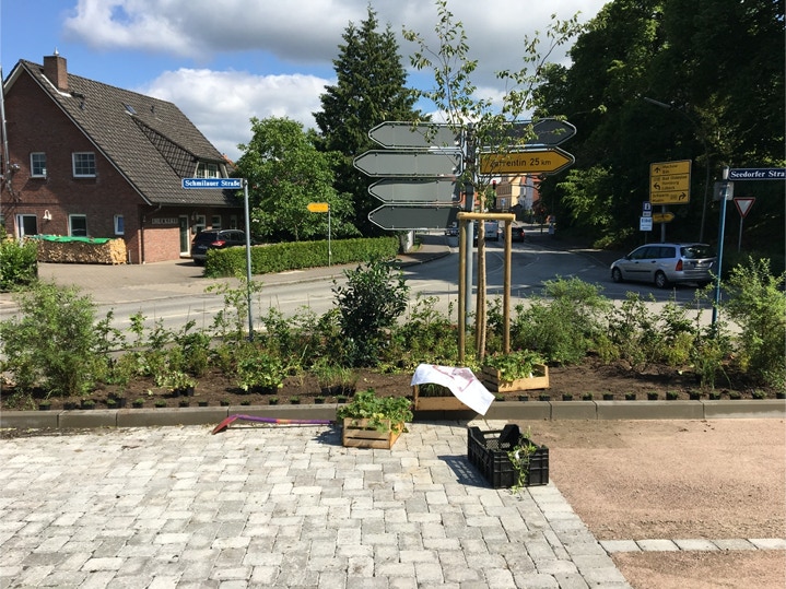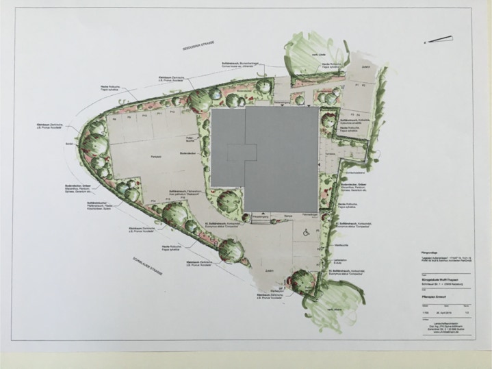 Es wurde ein Entwurfsplan mit dem Konzept der Bepflanzung erarbeitet. Das Grundstück wurde durch eine Hecke eingefasst, durch Hochstamm-Gehölze sowie Sträucher strukturiert und mit Stauden und Gräsern ergänzt.