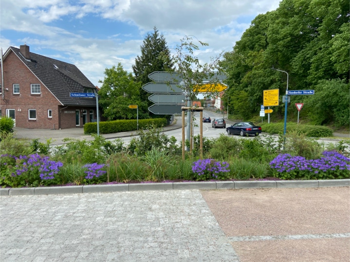 Auf Rasen wurde bei dieser Anlage verzichtet, da es mehrere kleine Flächen gibt, die das Mähen erschweren würden. Eine ausgewogene Gehölz-/ Staudenpflanzung benötigt außerdem weniger Pflegegänge als es der Rasen mit den regelmäßigen Mäheinsetzen erfordert.