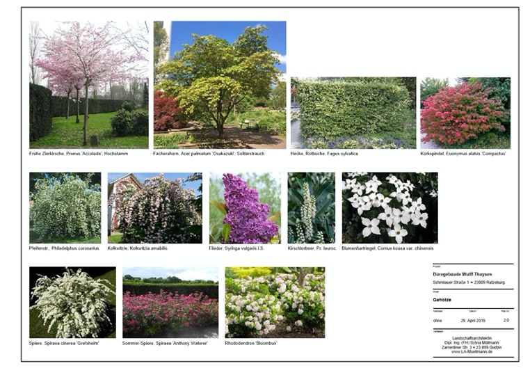 Anhand von Varianten wurde deutlich, an welchen Stellen die Zierkirschen das Grundstück in der Höhe gliedern sollten. Blühsträucher wie Spieren, Flieder, Jasmin, Schmetterlingsstrauch und Blumenhartriegel wechseln sich in ihrer Blühzeit ab.