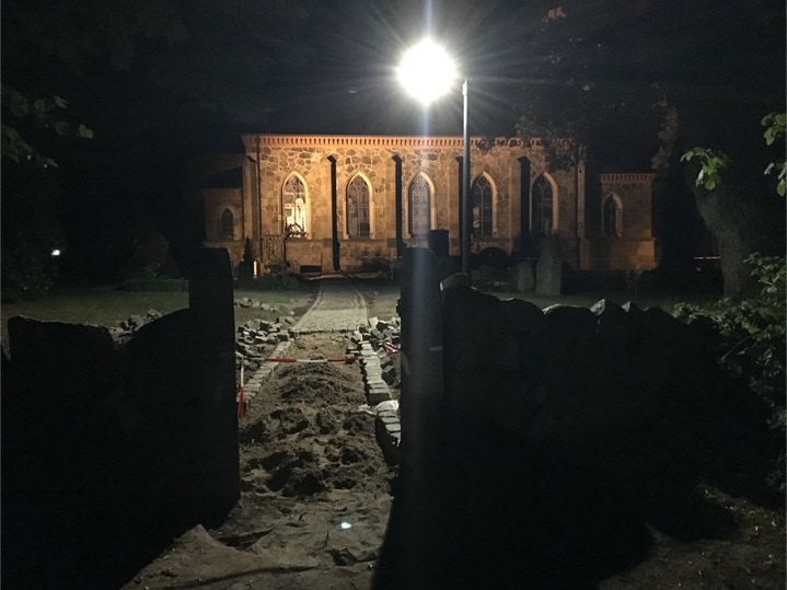 Zur besseren Beleuchtung des Weges wurde entsprechend der bereits vorhandenen eine weitere Mastleuchte inklusive der Kabelarbeiten notwendig.