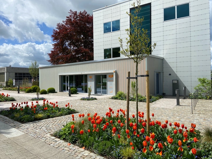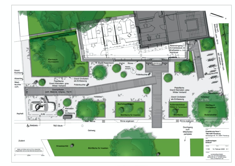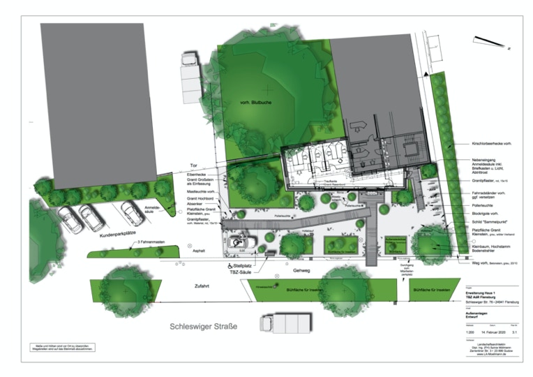Das Technische Betriebszentrum (TBZ) ist zentraler Dienstleister für die Stadt Flensburg und zuständig für Straßenbau und Grünflächenpflege/Forst, Entwässerung, Abfallbeseitigung und Stadtreinigung. Am Hauptgebäude in der Schleswiger Straße wurde für die Kunden und Besucher ein neues Kundenzentrum angebaut. Der Auftrag war es, den Entwurf für die Außenanlage zu planen. Dazu gehörten mehrere Varianten…