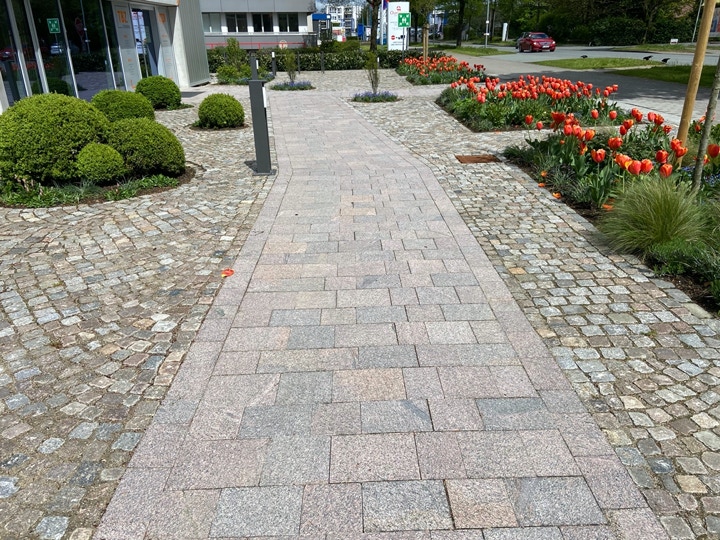 Die Pflasterarbeiten, die Pflanzenauswahl und Bepflanzung wurden von den betriebseigenen Gewerken / Mitarbeitern ausgeführt.