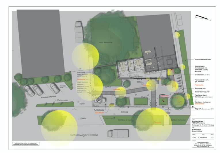 Ein Elektroplan wurde erarbeitet, in dem u.a. die Standorte der Pollerleuchten, Strahler, Steckdosen für die Weihnachtsbaumbeleuchtung dargestellt sind.